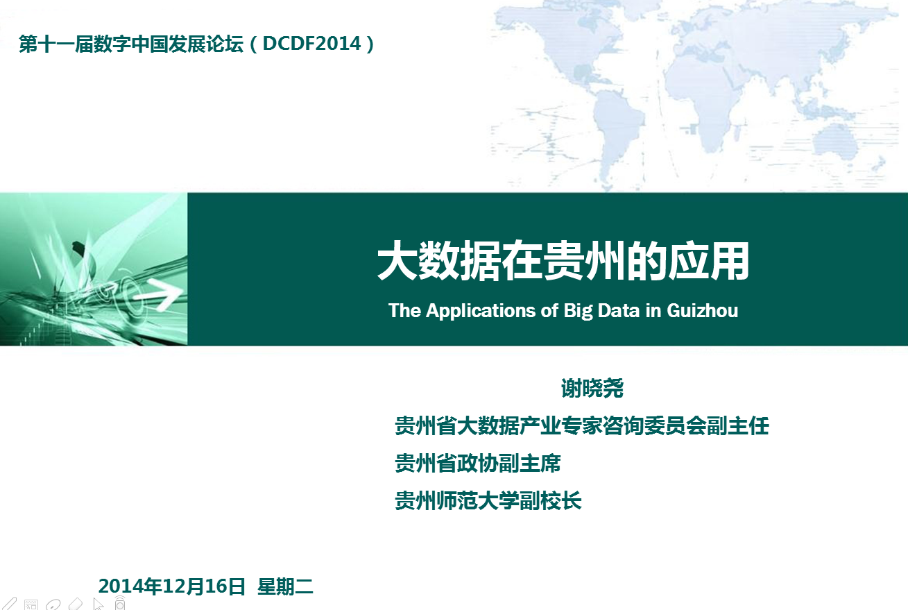 2014年12月16日,“第十一届数字中国高层论坛(DCDF2014)”在贵州师范大学宝山校区隆重召开。本届论坛由贵州科学院、北京大学数字中国研究院、国际数字地球学会中国国家委员会、人民日报社《民生周刊》杂志社和贵州师范大学联合举办。来自国内外的近200名政府高层官员、著名院士、专家学者和知名企业家参加了开幕式。